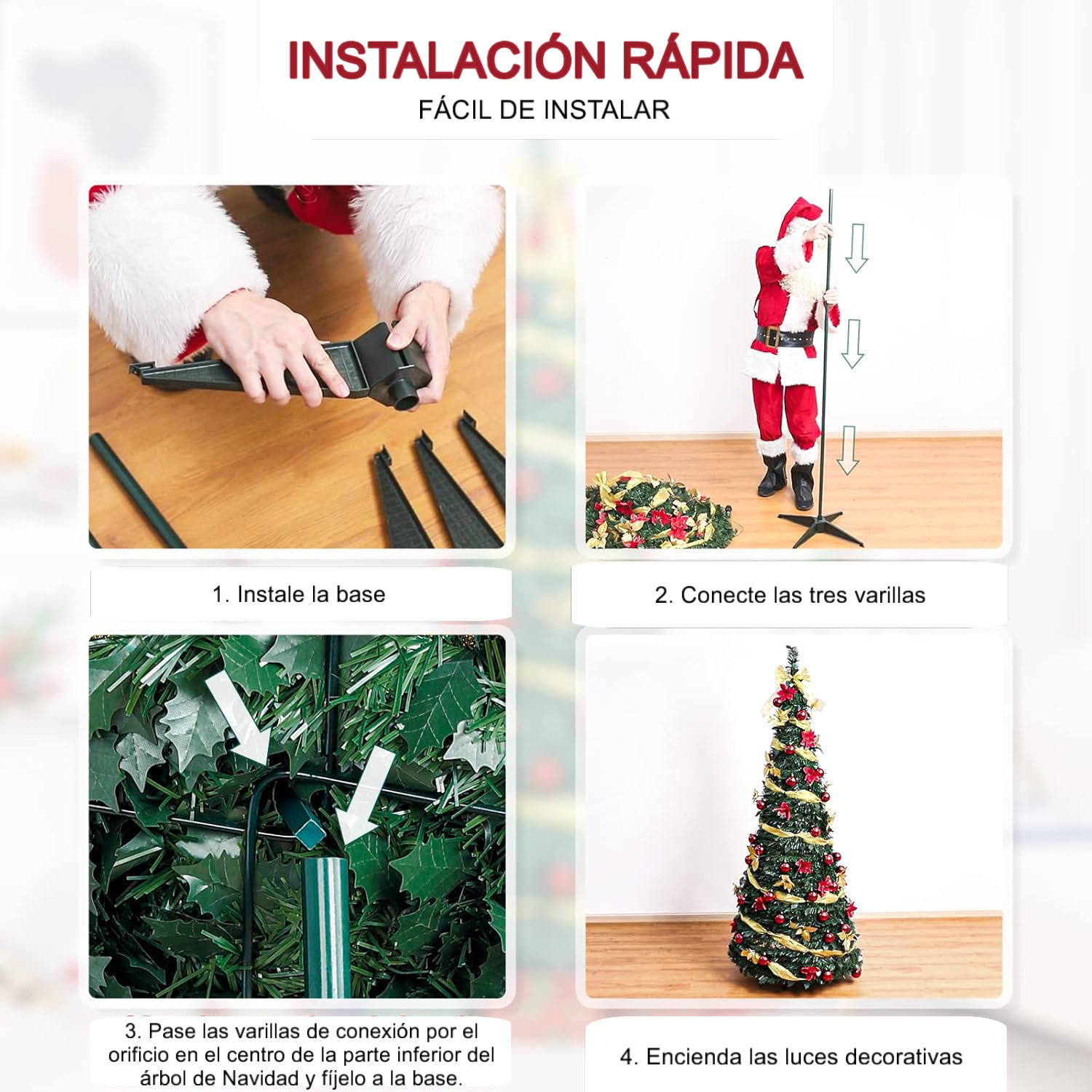 Solo instalás la base, conectás las varillas, fijás el árbol y encendés las luces. Listo en minutos y sin enredos.