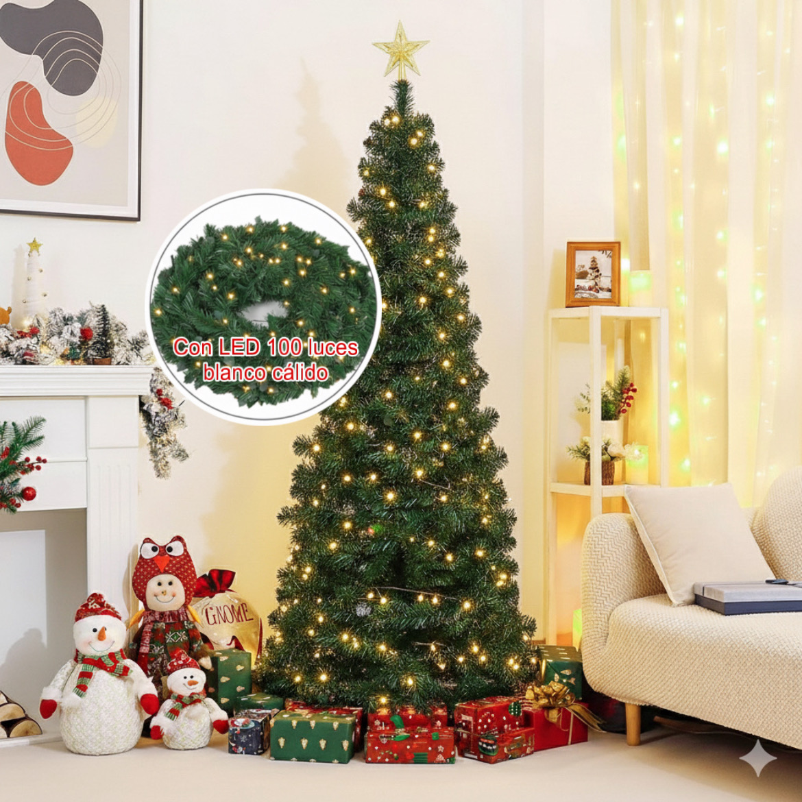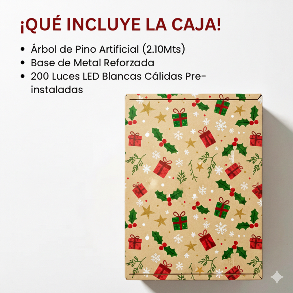 Contiene pino plegable, las varillas de armado y un set de 100 luces LED blanco cálido.
